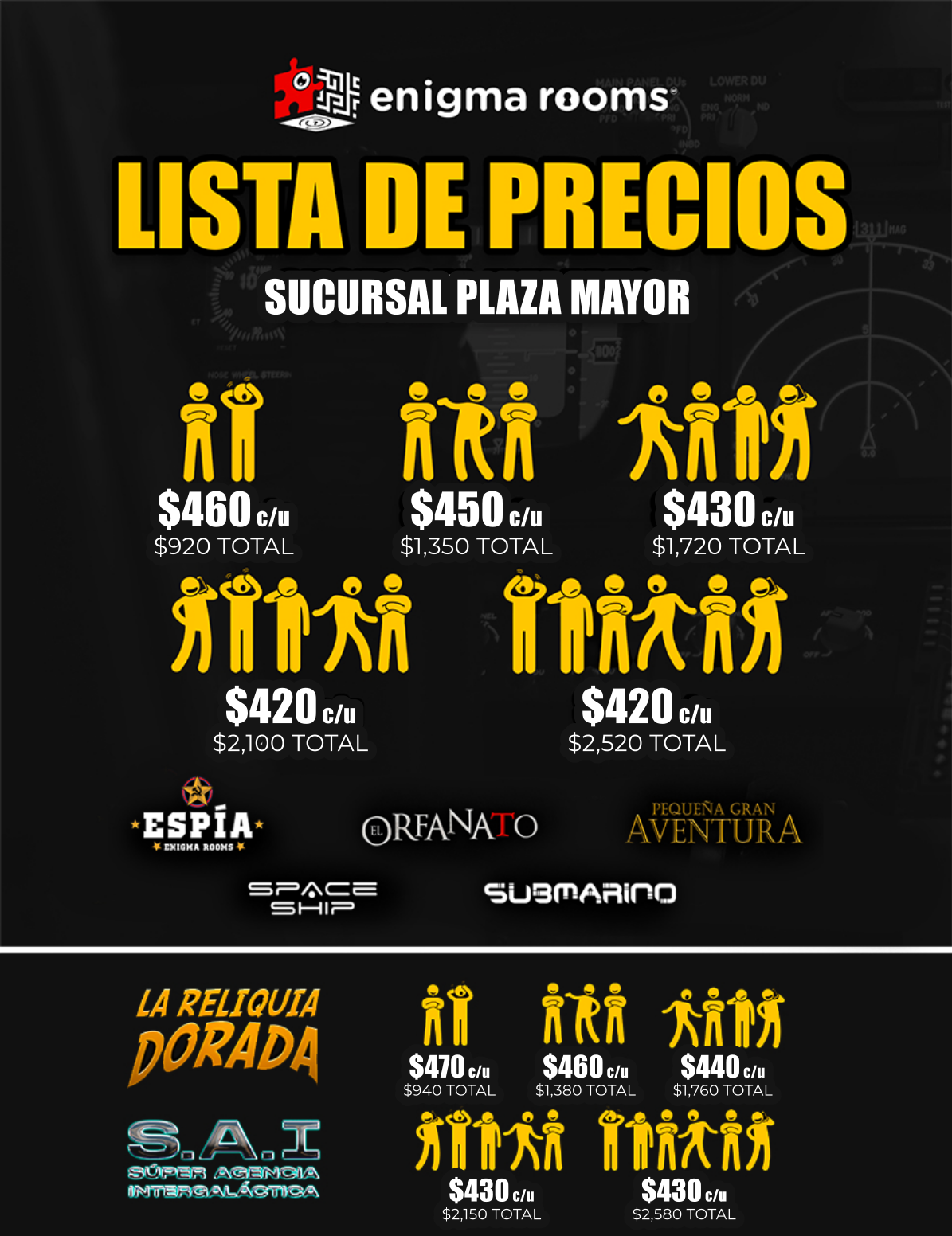 Los precios señalados son en MXN e incluyen 60 minutos máximo de juego en el Enigma Room® de tu elección. Todos los precios son más IVA, en caso de requerir factura. La factura se debe solicitar el día del evento, siendo únicamente facturable en el mes en el que se genera el ticket de venta.